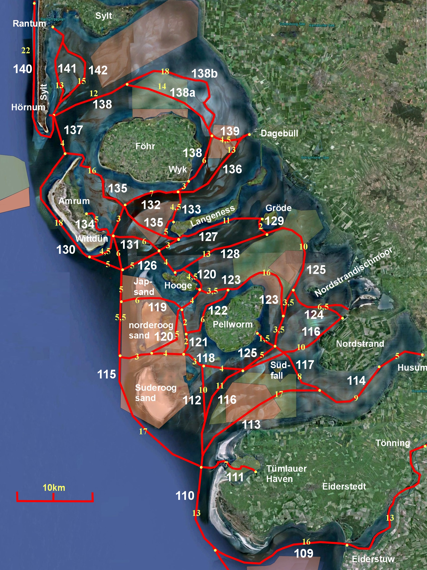 Elke beschrijving heeft de opbouw: het vertrekpunt-eindpunt, de routenummers (zie kaart), de globale afstand in km, de beste vaartijd rond het plaatselijk hoogwater (± verschil met hoogwater Helgoland (±Hl) in minuten, voor getijdentabel Helgoland zie Helgoland getijdentabel), de route met de gunstigste stromingen (opkomend/afgaand) op het traject en eventueel een beschrijving met nadere informatie. Hoewel de afstand tot op één decimaal worden gegeven, kan de afstand in de praktijk anders uitvallen, afhankelijk van de exacte vaarroute.