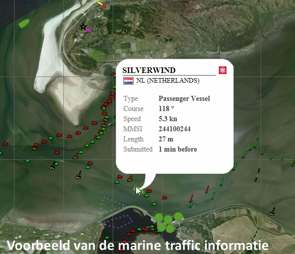 Een leuke en handige voorziening in openseamap voor als je in een druk vaargebied gaat varen, is de optie Marine traffic, waarbij alle schepen die via het marine trafic project zijn te traceren worden getoond. Als je een schip aanklikt verschijnen de gegevens van het desbetreffende schip.